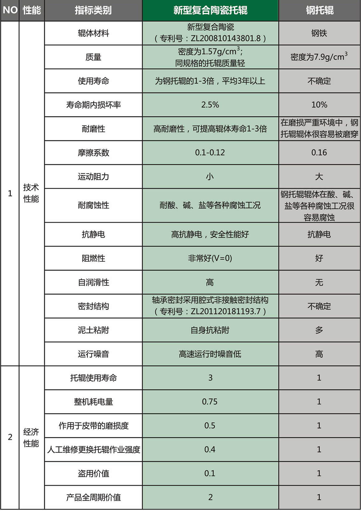 ![]() | 1 表中經(jīng)濟(jì)性能數(shù)值以鋼托輥為基準(zhǔn)值1,復(fù)合陶瓷托輥與其的比值; 2 通過(guò)我司多個(gè)項(xiàng)目的數(shù)據(jù)對(duì)比及理論計(jì)算,采用“映鴻”新型復(fù)合陶瓷托輥,皮帶機(jī)減速機(jī)的電流值降低約為(0.15-0.2) P,其中P為電機(jī)額定功率。例如:一條帶寬B800 ,輸送量200T/h,傾斜角度13°,帶速1.6m/s,長(zhǎng)80米的皮帶機(jī),其功率按55KW,以0.62元/小時(shí)計(jì)算,采用“映鴻”新型復(fù)合陶瓷托輥后,有效電流值降低約為9A,每年估算節(jié)約費(fèi)用約為1.732x0.38x9x0.8x24x365=41511元。 3 新型復(fù)合陶瓷托輥技術(shù)指標(biāo)全面領(lǐng)先,綜合性能好,即使在采用鋼托輥可能使用不到6000小時(shí)復(fù)雜的工況下,我司產(chǎn)品能保證使用20000小時(shí),即我司的托輥的產(chǎn)品全周期成本為鋼托輥的1/2 ;新型復(fù)合陶瓷托輥?zhàn)詽?rùn)滑性好、摩擦系數(shù)小、對(duì)皮帶的磨損小,大大延長(zhǎng)皮帶的使用壽命。 通過(guò)以上對(duì)比,采用“映鴻”新型復(fù)合陶瓷托輥,皮帶機(jī)運(yùn)行阻力小,運(yùn)行故障率低,維護(hù)勞動(dòng) 量低,節(jié)能環(huán)保,產(chǎn)品全周期成本低?!坝厨櫋毙滦蛷?fù)合陶瓷托輥國(guó)內(nèi)外首創(chuàng),處于國(guó)際領(lǐng)先水平。 |